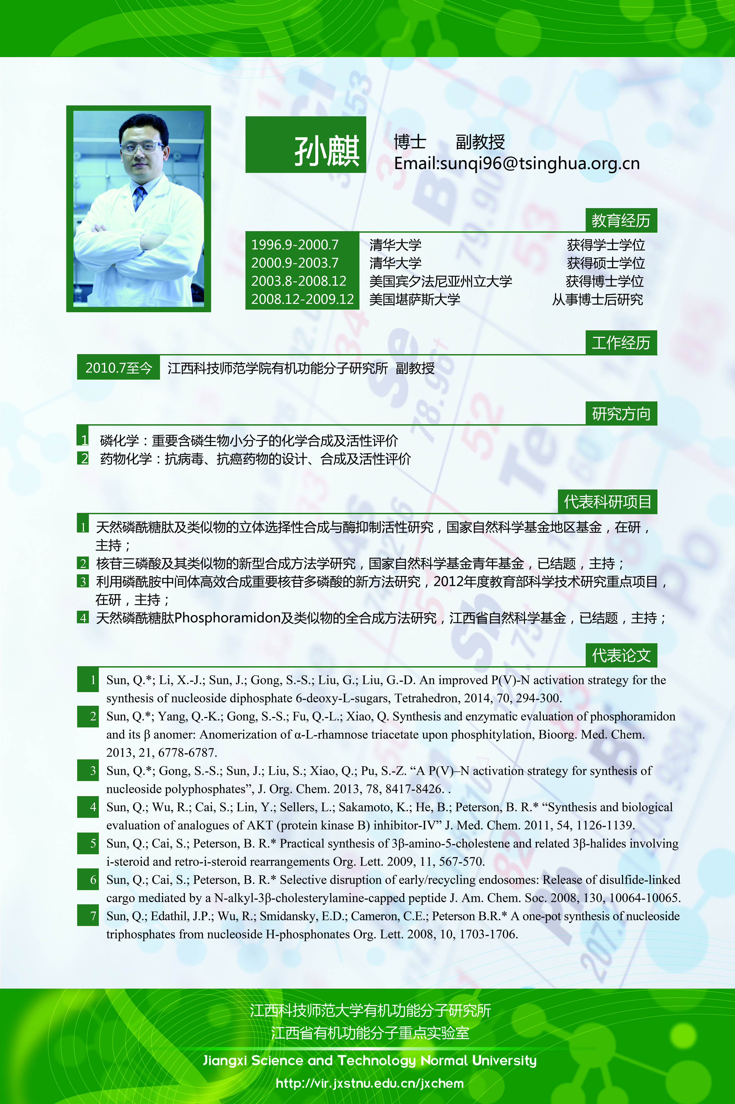 孙麒 教授 研究方向:重要含磷小分子以及抗病毒、抗癌药物的化学合成及活性评价-江西省有机功能分子研究所