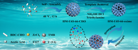 从海水中高效提取铀对于确保核能的可持续发展至关重要。因此,该论文通过软模板策略结合一步后合成改性(PSM)开发了一种创新的分层介孔金属有机框架(HM-UiO-66-oxime),以实现高效的铀吸附。HM-UiO-66-oxime为铀的吸附提供了充足的吸附位点和较大的接触面积,多孔通道结构有利于 UO22+ 快速扩散到吸附剂中,使材料只需20 min 即可达到吸附平衡。引人注目的是,使用一步PSM策略,HM-UiO-66-oxime的铀提取能力在pH=6下可达483.09 mg.g−1。此外,在天然海水中浸泡16天后,可实现7.47 mg-U/g-Ads的高铀吸收能力,并具有优异的吸附亲和力。因此,这项工作不仅推进了多级介孔MOF(HM-MOFs)吸附剂的设计和开发,而且在重金属分离和药物递送等其他领域显示出巨大的应用潜力。