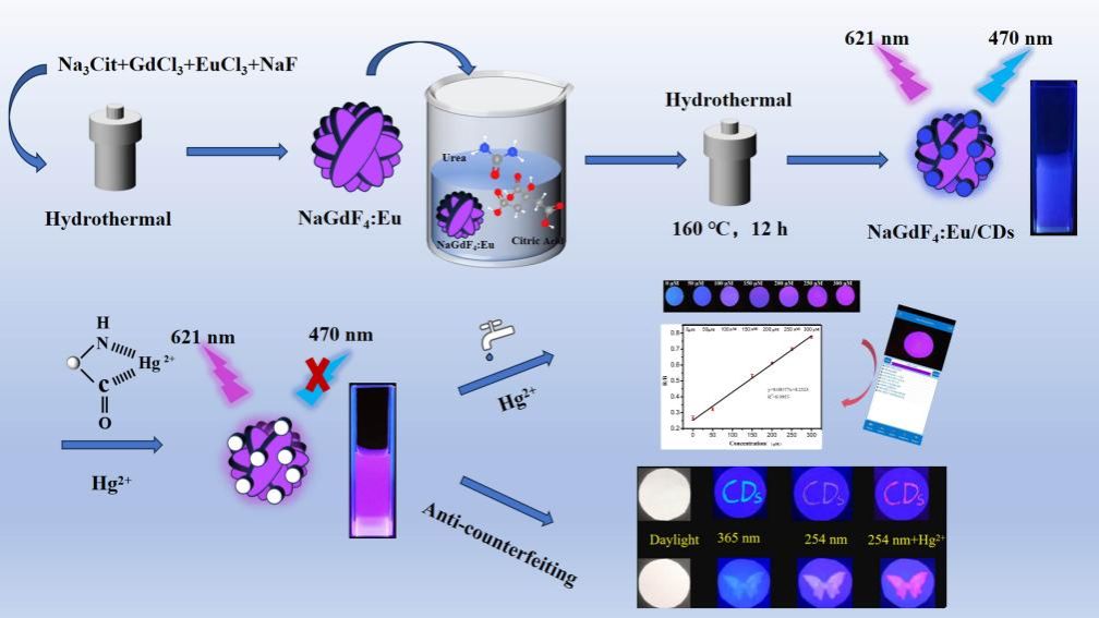 近日,江西科技师范大学有机功能分子重点实验室肖强教授团队在《Microchemical journal》上发表了题为“Dual-emissive NaGdF4:Eu/CDs nanocomposites for visual and quantitative detection of Hg2+ and anti-counterfeiting application”的最新研究成果。