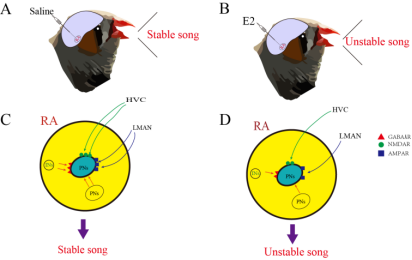 研究首次系统阐释了雌激素通过GPER受体快速调节RA核兴奋性与抑制性突触平衡,从而影响鸣唱稳定性的新机制。该发现不仅深化了对激素调控鸟类鸣唱行为时空调控规律的理解,也为脊椎动物精细运动技能的神经内分泌调控研究提供了新视角。