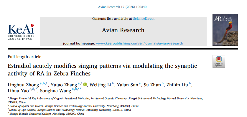 近日,江西科技师范大学有机功能分子研究所在国际权威期刊《Avian Research》(中国科学院生物学大类和鸟类学小类均为1区Top期刊)发表了题为《Estradiol acutely modifies singing patterns via modulating the synaptic activity of RA in Zebra Finches》的实验研究论文。我校2023级硕士研究生钟玲华与2020级硕士研究生张宇桃为论文共同第一作者,我校王松华副教授与姚丽华教授为共同通讯作者,江西科技师范大学为第一完成单位。