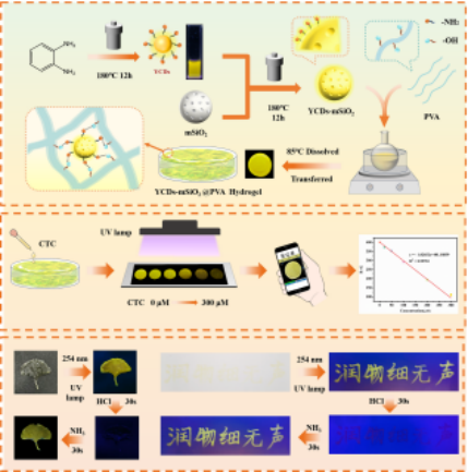 近年来,多功能智能响应材料备受关注,碳点(CDs)因其独特的光学与电学特性、低成本及低毒性,在智能材料领域展现出巨大潜力。为解决碳点在聚集态时存在的荧光猝灭问题并进一步提升其光学与电学性能,研究者提出了多种基质用于固定碳点以构建碳点基纳米复合材料。该工作通过将水热法制备的黄色荧光碳点(YCDs)掺入二氧化硅(mSiO2)中,然后与聚乙烯醇(PVA)融合,获得了一种用于金霉素(CTC)可视化检测和防伪的荧光智能水凝胶(YCDs-mSiO2@PVA)。在 254 nm紫外光激发下,该智能水凝胶发出强烈的黄色荧光,而 CTC 能够选择性地猝灭该荧光。结合智能手机的颜色识别软件,开发了一种可视化的 CTC 现场检测平台,用于测定实际水样中的 CTC 浓度,结果令人满意。该复合材料中,YCDs提供了稳定的荧光传感单元,mSiO₂的物理隔离效应有效抑制YCDs聚集猝灭,且有效避免其泄露,PVA凝胶基质则赋予了体系便携性、稳定性和可回收性。此外,酸性环境下水凝胶的黄色荧光大大减弱,而碱处理则使其荧光再生。这种现象使得该水凝胶适合作为多级荧光防伪,通过酸碱处理实现信息的加密和解密。这项工作为构建基于 CD 的水凝胶提供了有价值的参考方法,并拓宽了其在原位和可视化传感技术、数据存储解决方案以及信息安全系统中的多功能应用。