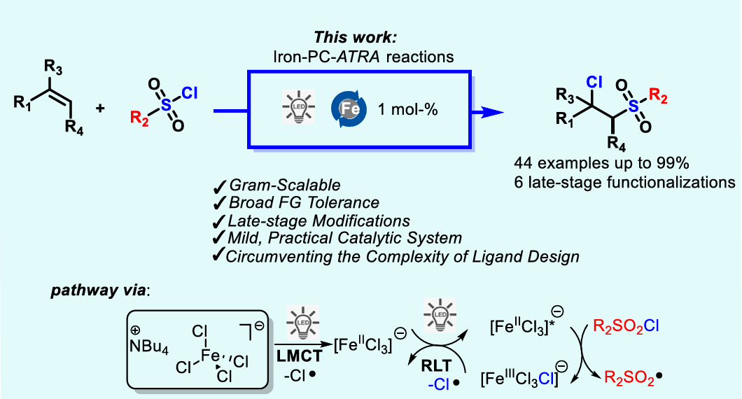 本文发展了一种可见光促进的铁催化烯烃氯磺酰化原子转移自由基加成反应。反应在无需外加配体的条件下,以简便合成的TBA[FeCl₄]为催化剂,高效构建了一系列氯磺酰化产物。该反应底物范围广泛,官能团耐受性高,可成功将雌酮、萘普生、布洛芬等药物分子或天然产物衍生物引入目标骨架。克级实验和后期功能化修饰进一步证明了该方法的实用性和工业应用潜力。机理研究表明,TBA[FeCl₄]在可见光激发下发生配体到金属的电荷转移LMCT,生成氯自由基和关键的铁(II)中间体,进而通过单电子转移活化磺酰氯,生成磺酰自由基,随后经自由基加成和自由基配体转移过程完成催化循环。